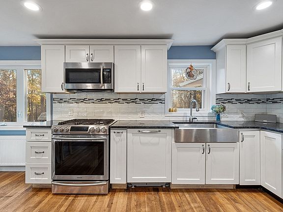 A HOLDIAY GIFT FOR YOU! Wonderful 3-4 bedroom cape style home with lovely updates! Living room offers a fireplace for those wintry nights ahead and HW floors. Updated eat-in kitchen with white cabinets, granite counters, propane gas cooking, recessed lighting and SS appliances. First floor offers a bedroom and an office which could be your fourth bedroom both with HW floors. There is also an updated full bath. Second level offers a primary bedroom with multiple closets and HW floors, an additional bedroom with HW floors and 3/4 updated bath. Bonus room on lower level with a split air system offering heat and CA just needs some finishing touches. Opposite side of LL offers the utilities, storage space and is a walk-out. You will love the sun room with cathedral ceilings and an abundance of light that leads to an attractive and very spacious deck that overlooks a delightful yard with a patio area with a firepit and a swing set that will remain.