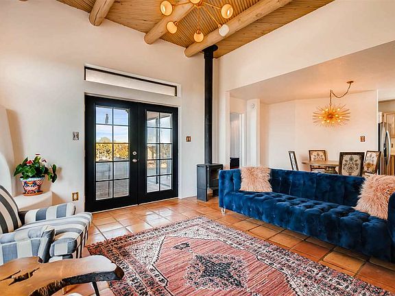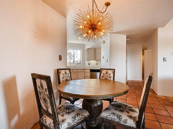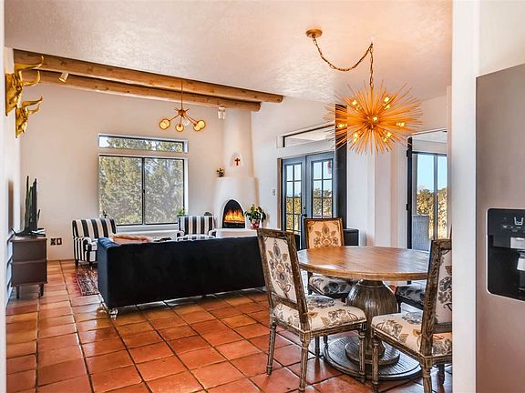 Amazing Jemez views from this Eldorado charmer. Sited on a large greenbelt lot providing privacy and the feeling of space. Enormous walled front flagstone courtyard with raised beds. In-floor radiant heat, good bedroom separation with Saltillo tile throughout and real wood plank floors in the guest rooms. New refrigerator, newish dishwasher and range. Brand new furniture conveys with the property. Newly painted. Finished 2-car garage. Ready to go. Would make a wonderful investment property for long or short-term rentals. On the Eldorado Community Water System. NO STEPS