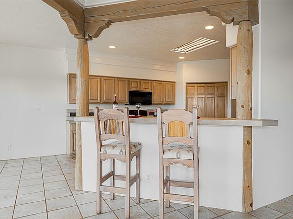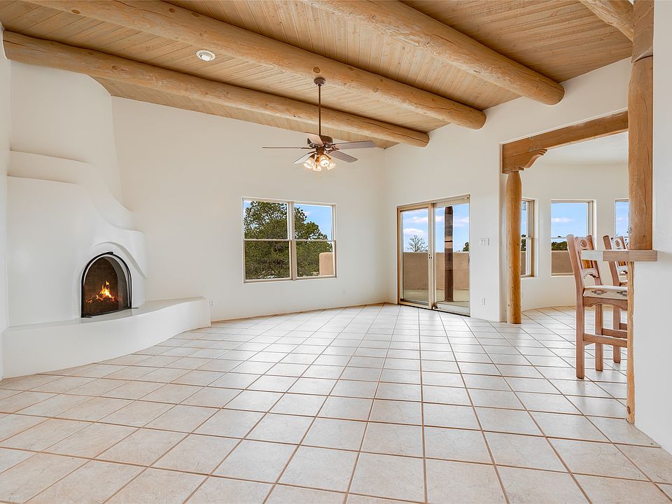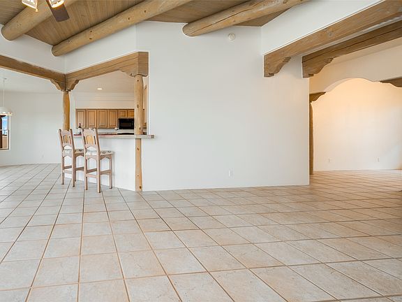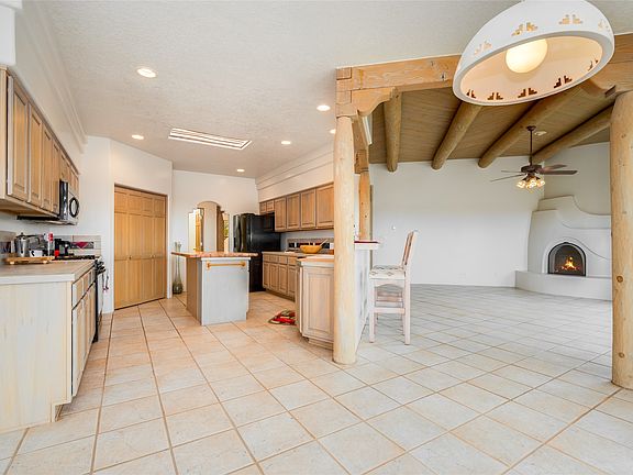 There is so much to offer in this single level home! The floor plan is spacious and open highlighting a generously proportioned living room with soaring ceiling, vigas, beams, corbels, views to the Cerrillos Hills, and a lovely Kiva fireplace. Adjacent to the living room is the breakfast nook featuring a curved wall and 4 large windows perfectly sited to view the Jemez mountains. Moving from the breakfast nook is a spacious kitchen with a center island offering an abundance of storage. There are long counters and a handy pantry for all your extra storage needs. The home offers a separate dining room with easterly views of the Eldorado Wilderness Preserve that could easily be a Home Office! There is great bedroom separation. The primary bedroom features a gas fireplace, French doors to the rear patio and stunning views of the Sangre foothills! The oversized garage could make a great workshop, crafts, area, or provide additional storage. The seller will offer a credit to buyer to re-stucco the home. Eldorado is home to The Eldorado Studio Tour, the largest studio tour in the state, shopping, dining, K-9 school, library, senior center, community center, summertime pool, miles of hiking and biking trails, and skies so clear you really can see The Milky Way! About 20 minutes to The Santa Fe Plaza!