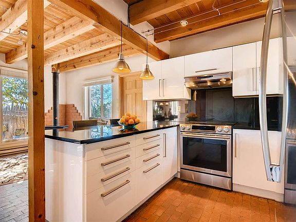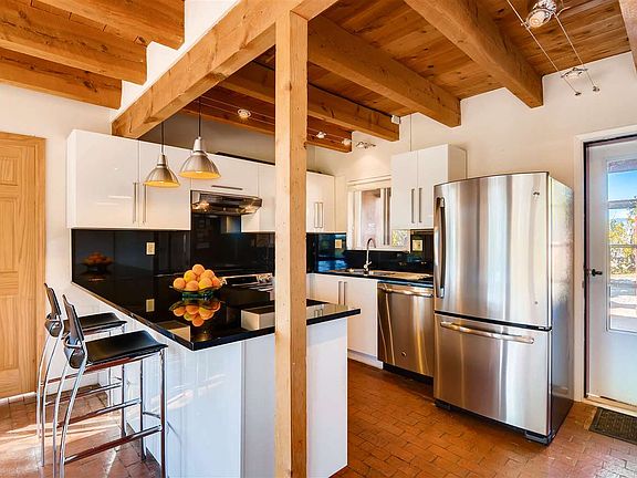 Darling updated passive solar gem with beautiful two room casita or studio space completed in 2016. Casita is one level, 624 sq. ft., 3/4 bath with walk-in shower, perfect for guests, parents or artists. Both have abundant natural light with generous windows and skylights. The main house is a true passive solar with brick floors, a new kitchen, stainless appliances and granite counter tops. Two bedrooms, two full baths plus office space. Two 500-gallon above ground cisterns for free landscape watering. Located on a greenbelt in a serene, peaceful and quiet area of Eldorado. Solar hot water. Recent roof maintenance on torchdown roof. On the Eldorado community Water System. Truly a must see.