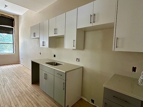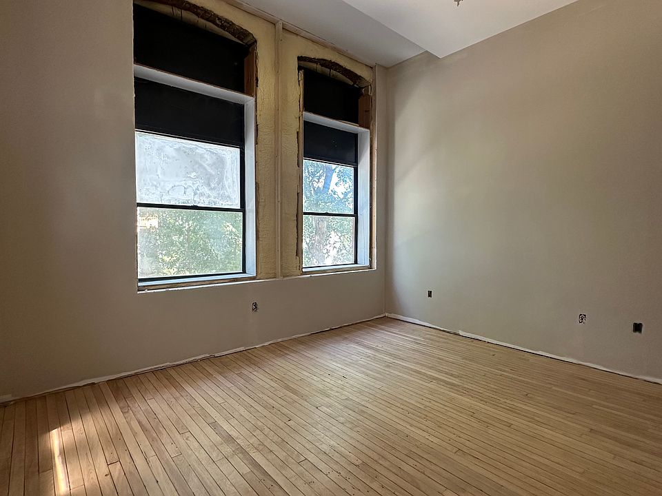 Apartment 5 is a gorgeous studio apartment on the main level that boasts tons of natural sunlight with its tall windows and over 11-foot ceilings. This apartment offers a beautiful brand-new kitchen that flows seamlessly into the bedroom and living room space. In the kitchen you'll enjoy the quartz countertops, soft close cabinets and an energy-efficient GE appliance package including a dishwasher and full-sized in-home laundry. The original hard wood flooring has been restored and refinished. Off of the living space you'll find two closets. The bathroom has a beautiful tile flooring and a walk-in shower. We also offer designer overhead lighting throughout.