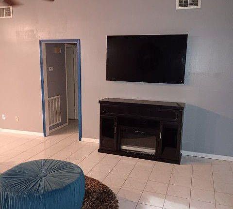 Cozy corner fireplaceFresh paintUpdated ceiling fanTile flooringNatural lightTile backsplashVaulted ceilings