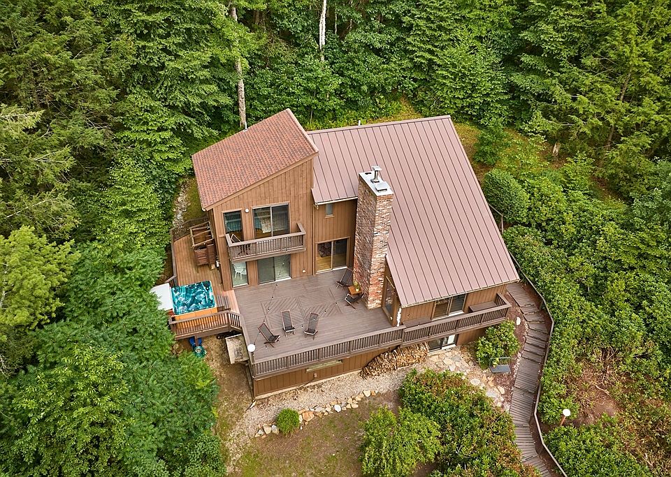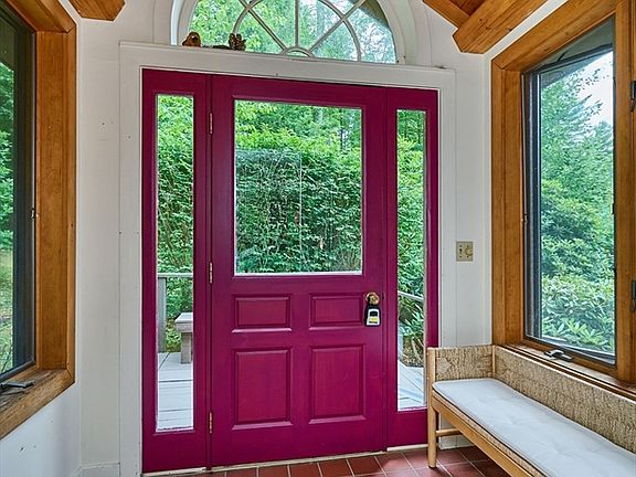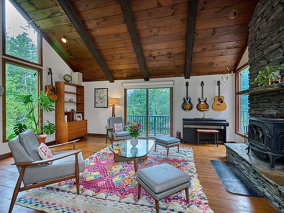 The Best of Both Worlds! Buyers, delight in Mid-Century Modern Contemporary in country setting in Pelham at the trailhead of the Cadwell State Forest, just 10 mins. to Amherst, the academic hub of the Five College area. This beautifully maintained, 3-bedrm, 2.5-bath home w/ 2 car vehicle-port is sited at the end of a serene, 10 house cul-de-sac & comprises 2,441 sq. ft. on 3 levels. Step into the LR & your gaze lands on a massive, Goshen stone FP soaring upwards into cathedral ceilings framed by a 2nd floor balcony. The floor-to-ceiling windows bring the outside in, flooding the interior with light & affording views to amazing sunsets. Adjacent are DR & eat-in kitchen w/ slider access to an expansive deck, complete w/ hot tub & shower. Or go rather into east facing, encld porch to sup & enjoy backyard activities. Upstairs are ensuite main bedrm w/ balcony + 2 bedrms & full bath. A huge 1st level sports Fam Rm w/ 2nd firepl. & built-ins & a 2nd space ideal for gym/ office/media rm.