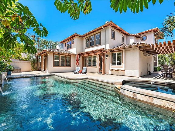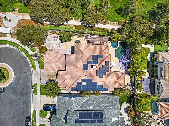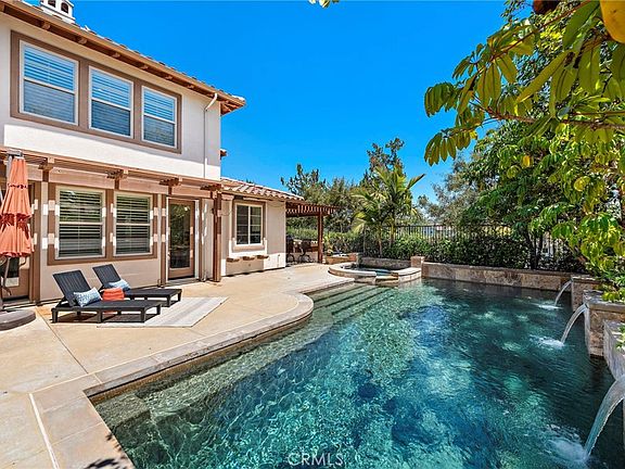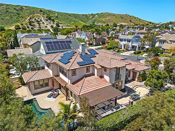 Nestled at the end of an elevated cul-de-sac in the serene Terramor Village neighborhood of Evergreen at Ladera Ranch, this freshly upgraded home offers the warm embrace of private luxury. Natural light illuminates the spacious five-bedroom, four- and one-half-bath residence, which features one suite on the main level and a loft upstairs. A graceful fireplace and custom built-in shelving and cabinetry enriches the formal living room, and the dining room is destined to be a favorite setting for special times. Enjoy the generous space of a family room with extra sun room area, which opens to the backyard. Today’s most desirable appointments are on display in a newly upgraded kitchen that hosts an island, quartz countertops, Shaker cabinetry to the ceiling, a breakfast room with updated fireplace and custom mantle, open shelving, full backsplash, a walk-in pantry, butler’s pantry with beverage refrigerator, new Thermador appliances, a built-in refrigerator, and a beverage bar. Archways, fashionable wide-plank white oak flooring, newer carpet, an elegant staircase, Juliet balconies, designer tile, plantation shutters, modern bath finishes and fixtures, custom shelving and custom crown and base molding elevate style throughout the two-level design of approximately 3,711 square feet. Owners can luxuriate in a primary suite that reveals a generous walk-in closet with custom finishes, soaking tub, separate shower, separate vanities, and a sit-down vanity. Solar power and a three-car garage are also on the lengthy list of impressive features. Private grounds span nearly 7,630 square feet and are upgraded with a gated front patio, a covered outdoor kitchen with BBQ bar, and a lush backyard with pool, spa, neighborhood views and an open-air fireplace. Residents of Terramor Village at Ladera Ranch live close to aquatic and skate parks, plunge parks, disc golf, trails, and outstanding public schools.