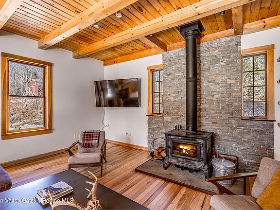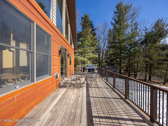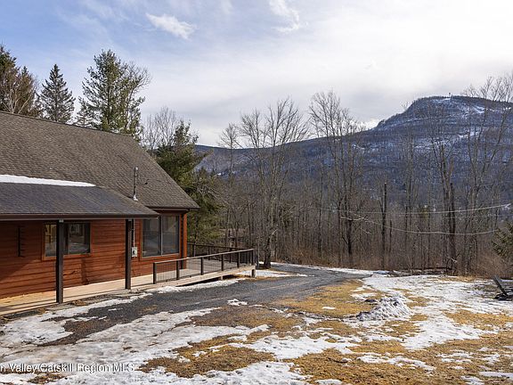 Nestled amidst the breathtaking beauty of the Catskill Mountains in the coveted town of Hunter, this stunning 3-bedroom, 2.5-bathroom retreat on just over an acre offers the perfect blend of privacy, comfort, and adventure. Located at the end of a dead-end lane just minutes from world-class skiing at Hunter Mountain, this property is a dream come true for outdoor enthusiasts and those seeking a peaceful mountain escape. A bright and airy interior, boasts a spacious layout perfect for entertaining and unwinding. The home is designed for comfortable living, with ample room for family and friends and a large loft space upstairs to accommodate overflow. Gather around the impressive hearth on chilly evenings, creating lasting memories with loved ones. The warm glow and crackling flames provide the perfect ambiance for cozy nights in. Step out onto the expansive deck and soak in the breathtaking mountain views. Large windows throughout the home flood the interior with natural light, creating a bright and cheerful atmosphere. Sale to include parcel 164.05-2-13 for a total of 1.2 acres.