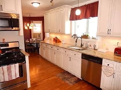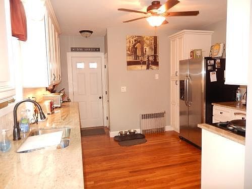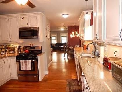 Sunny spacious Modern, 5 Rms, newly renovated unit with hard wood flrs, granite, stainless steel appliances, yard, storage, washer and dryer hook up, lots of closets, large rooms, quite family oriented street walking distance to park and tennis courts, bus line and T and commuter rail assisible. 4 miles to Boston close to all major highways and surrounding cities. By owner no fees, owner pays for hot water.
