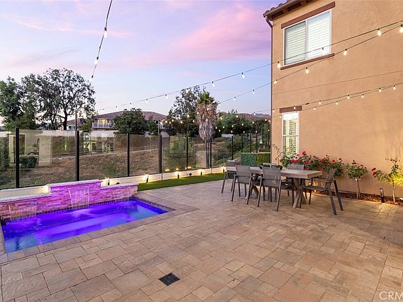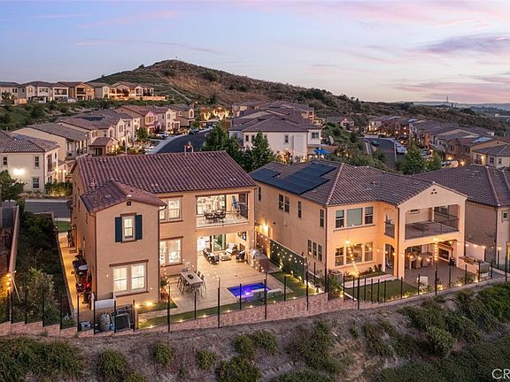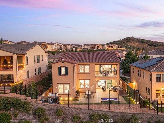 Welcoming scenic hillside and evening-light views from gorgeous indoor and outdoor living areas, this exquisite Skyridge home in Mission Viejo is ready for move-in. The residence presents an inviting covered entry porch that is ideal for socializing with friends and neighbors, setting the scene for a lifestyle many can only dream of. Indoors, four bedrooms and three baths are featured in approximately 2,874 square feet, with one bedroom located on the main floor. A double-height ceiling and dramatic multi-tiered staircase impress in the foyer, which leads directly to an open-concept great room with in-ceiling surround sound and a sunny dining room. White cabinetry and granite countertops shine in the newly remodeled kitchen, which also displays an oversized island, large walk-in pantry, Dekton countertops, and high-end stainless steel appliances including Bosch dishwasher, KitchenAid double oven, and a built-in Dacor refrigerator. Entertaining is elevated to impressive levels thanks to a slideaway glass door that opens the great room to loggia with built-in fireplace and a view-enhanced backyard with built-in BBQ and a saltwater spool with fountain. New engineered hardwood flooring, designer carpet, custom interior paint and plantation shutters lead a list of more than $175,000 in upgrades at the home, which also features custom digitally controlled landscape lighting, a security system, backyard sound system, whole-house wireless automation, and a two-car garage with EV charger, epoxy flooring and built-in cabinetry. Upstairs, a covered deck complements a large bonus room and the primary suite, where a walk-in closet with extensive custom built-ins, two sinks, a soaking tub and separate shower ensure luxurious personal comfort. Skyridge presents a private resort-inspired pool and is conveniently located near award-winning public schools, a Montessori school, Whiting Ranch Wilderness Park, Trabuco Canyon, Lake Forest Sports Park, The Shops at Mission Viejo, Lake Mission Viejo, beaches, freeways and the 241 Toll Road. There are no Mello-Roos and HOA dues are low.