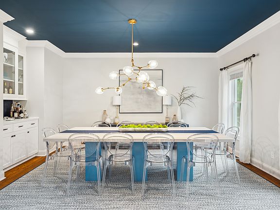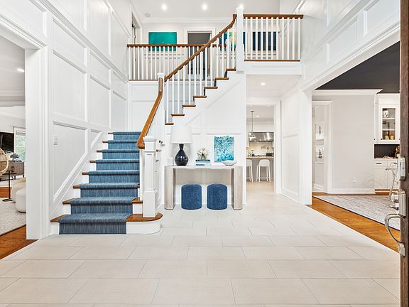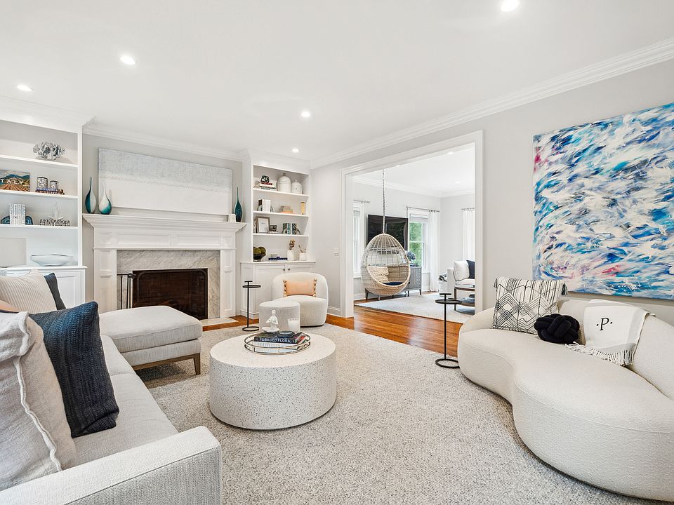sf of living space provides 5 bedrooms and 6 full bathrooms. A welcoming double-height foyer leads to a living room with a fireplace and a formal dining room. The stunning gourmet kitchen is open to the sitting/TV room and features sleek quartz countertops, designer cabinets, Sub-Zero refrigerator, Wolf Range, a bar area, and three sinks. Both the sitting room and kitchen offer access to the 42