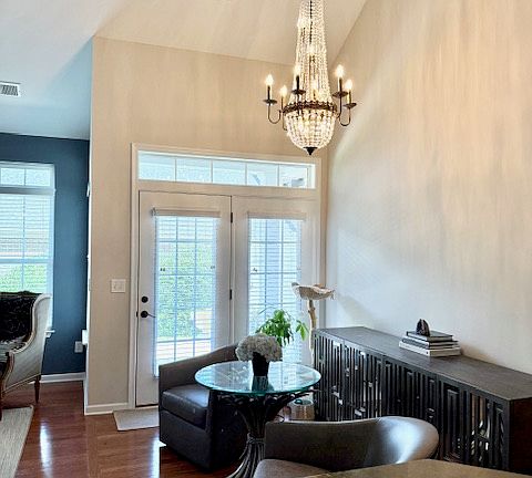 The home has been refreshed with new custom paint in soft, neutral blue hues and upgraded designer lighting throughout the first floor, creating a welcoming, elevated atmosphere that perfectly balances modern comfort and classic vintage character.