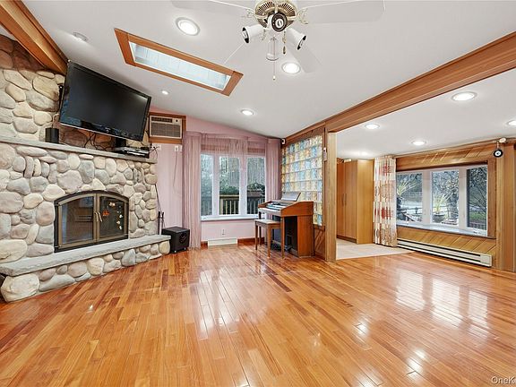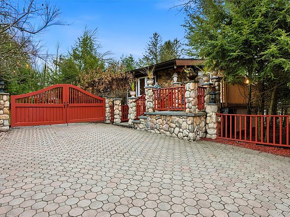 Luxury living in Sullivan County. Exceptional contemporary home on the only double corner lot in White Lake Homes Community. Minutes to Bethel Woods, Resort World Casino, golf, skiing, and the Delaware River. Enjoy lake rights to 300-acre Kauneonga/White Lake with your dock just down the block, as well as access to a community pool, clubhouse with weekend entertainment, tennis, playground, and more. This beautifully updated home features a heated brick driveway with EV charger and a gated entrance leading to a private backyard retreat. A spacious wraparound bluestone deck offers multiple seating and dining areas for relaxing in sun or shade. Inside, the enclosed porch opens to a bright living room with vaulted ceilings, Brazilian cherry wood floors, stone fireplace, and automatic rain-sensor skylights. The main level includes 2 bedrooms with custom closets and a full tiled bath. The lower level adds another 1,000+ sq ft of finished living space, including a large family room, two additional bedrooms, a flexible bedroom/livingroom with ensuite bath, private entry, and full laundry room. The star of the show is the impressive covered outdoor summer kitchen with stainless-steel appliances (BBQ grill, open grill, refrigerator, sink, beer cooler, and commercial vent), plus a large hot tub and pull-down movie screen. Privacy landscaping surrounds a serene stone pond with waterfall and a cedar-lined storage shed. Perfect for year-round living or a vacation getaway. Proof of funds or pre-approval required for showings.