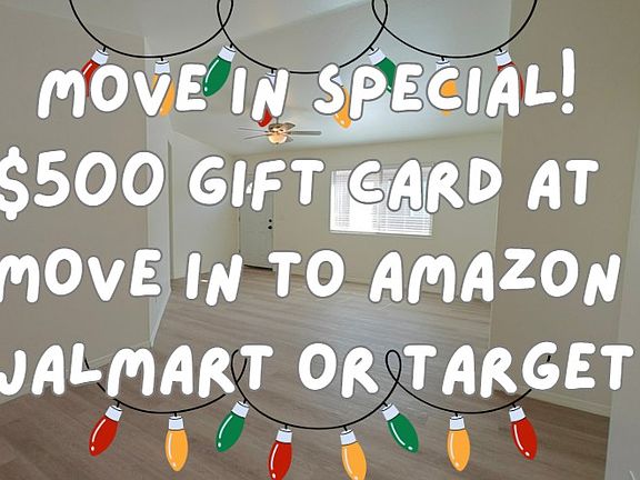 - Special offer! $500 GIFT CARD AT MOVE IN FOR QUALIFIED APPLICANTS TO AMAZON, WALMART OR TARGET.Expires December 31, 2025
