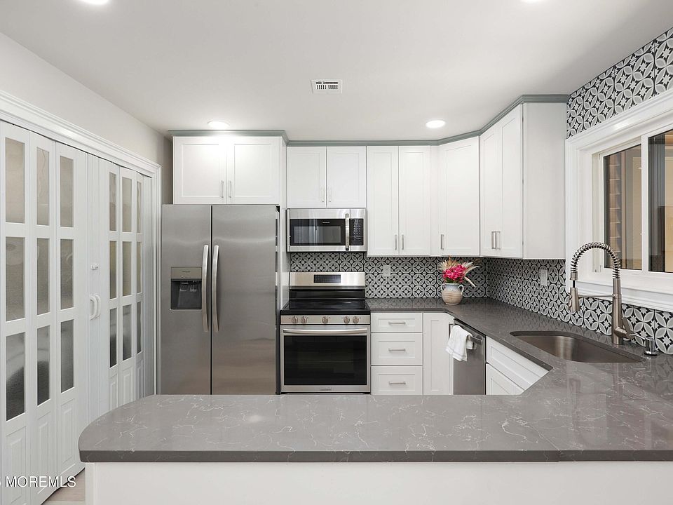 A stunning property that showcases the embodiment of elegance & modern living. Newly renovated custom-designed Villa 600 Ranch model with assigned parking spot right outside your front door, offers a spacious, comfortable layout perfect for those seeking a relaxed, maintenance-free lifestyle & boasting two bedrooms, two bathrooms & a den. The primary bedroom has a large custom closet, offering plenty of storage options & ensuring a clutter-free environment. The bathrooms have been redesigned to include spa-like custom tile showers, extra storage & beautiful vanities with granite countertops. Step into the living space & be captivated by the many contemporary touches. A wall of glass doors seamlessly connects the outside terrace to the den, providing an easy place to entertain or enjoy the picturesque surroundings. Recessed LED lighting illuminates the condo throughout, enhancing the modern aesthetic & creating a warm & welcoming feeling. This ranch has several upgrades designed to enhance comfort & convenience. Glass French doors, new thermostats for optimal climate control, luxury vinyl flooring in every room, new sliders & entrance door. The new HVAC system keeps the home cool during hot summer & cozy during the chilly winter months. The heart of this home is a brand-new kitchen blending functionality & style featuring stainless steel appliances, white shaker cabinets & granite countertops. Residents of Shadow Lake Village enjoy a host of amenities & community features, including access to a clubhouse, fitness center, swimming pool, & beautifully landscaped grounds. With convenient proximity to shopping, dining, & entertainment options, this property offers a truly exceptional lifestyle.