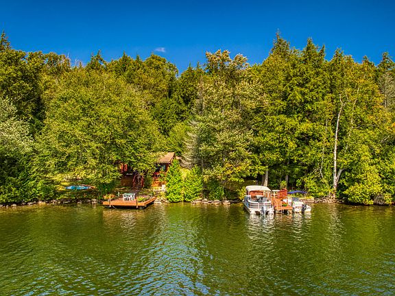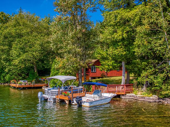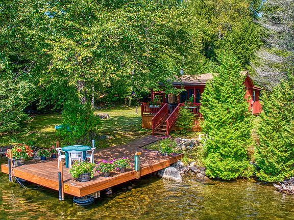 Camp Lillian, located on the southwest shore of Moose Island on Lake Placid, offers the charming combination of vintage camp life and modern cottage living. Two boat docks on the 150 feet of frontage provide excellent access to the older two-bedroom, one-bath cabin, located just feet from the shore. The large picture windows in the main room frame the peaceful lake view, with bedrooms behind it.