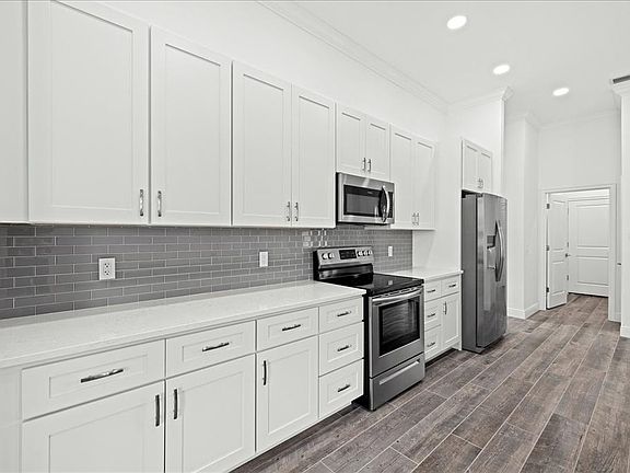 En-suite bathroomStunning waterfall islandWood-plank tile flooringImpact windowsCrown moldingPrimary suiteStainless steel appliances