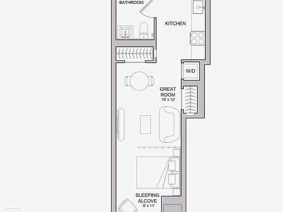 Designed to maximize light, comfort, and flow, this studio welcomes you with soaring ceilings and floor-to-ceiling windows that frame a backdrop of Bed-Stuy's storied streetscape. A thoughtfully placed sleeping alcove offers a private nook for rest, while the open living/dining space invites both relaxation and entertaining. The kitchen blends modern convenience with timeless charm, featuring shaker cabinetry, solid surface countertops, stainless steel appliances, and subtle lighting accents that create a warm glow in the evenings. Wide-plank floors run throughout, tying the space together with natural texture.