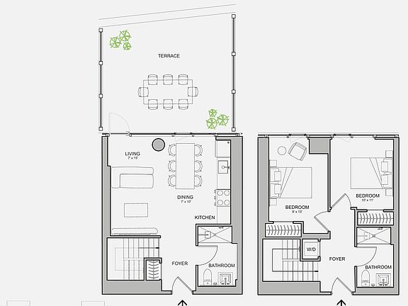 Residence G23 is a spacious two-bedroom, two-bathroom duplex that seamlessly blends indoor comfort with expansive outdoor living. The main level offers an open living and dining area that flows out to a large private terrace, perfect for entertaining or relaxing in the open air.