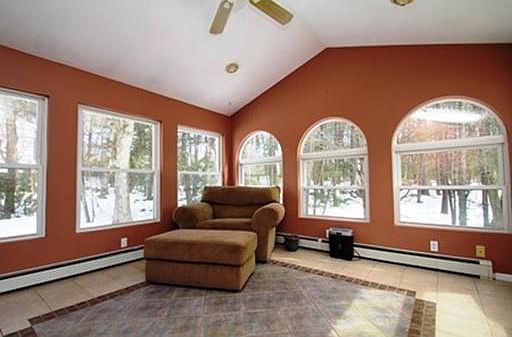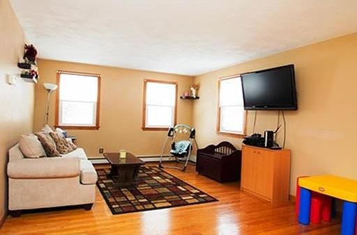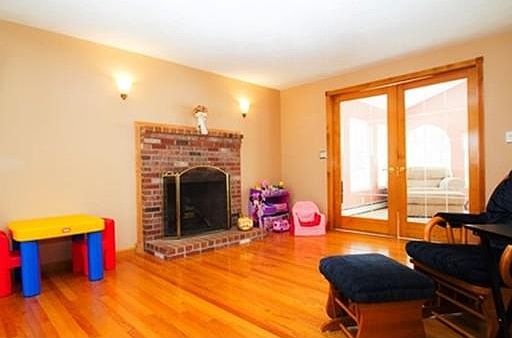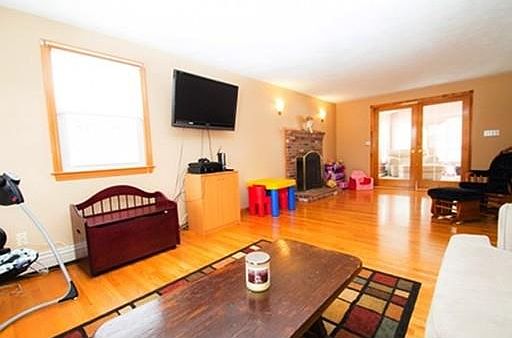 Open and spacious Split Gambrel near Burlington line offers easy access to commuting. Hardwood floors throughout living area and bedrooms. Kitchen with ceramic tile floor offers moveable island. Easy living with large dining area and exterior access to large double level deck. Front to back to living room with hardwood floors and brick fireplace is a great entertaining area with double French doors to a heated sunroom overlooking the large deck and lovely private wooded lot.1st floor half bath with laundry. 2nd floor offers full main bath and 3 bedrooms. Master bedroom with hardwood floors and is front to back with lots of closets and storage. Large lower level family room is front to back with lots of storage. 1 car gar and lots of off street parking.