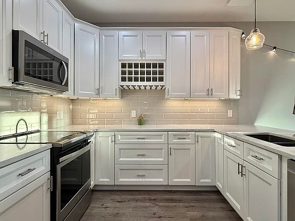 High ceilingsLarge windowsNatural lightElegant quartz countertopsWhite cabinetsStainless steel appliancesPaved driveway