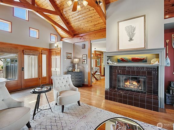 Experience luxury living on a beautifully landscaped half acre with stunning views of Sequim Bay, the Puget Sound, and Mt. Baker. This exceptional home features a concrete tile roof, wood beam ceilings & a lovely blend of flooring throughout. The main level offers a spacious living room, cozy den, and a chef’s kitchen with glass tile backsplash, quartz counters, island, stainless steel appliances, wine fridge, and dining nook. The primary suite includes a private ensuite & deck access. The lower level boasts a second full kitchen, stone fireplace, living room, three bedrooms, a bathroom, as well as patio access. This floorplan could be ideal for multi-generational living if needed, and definitely provides opportunities for a home office.