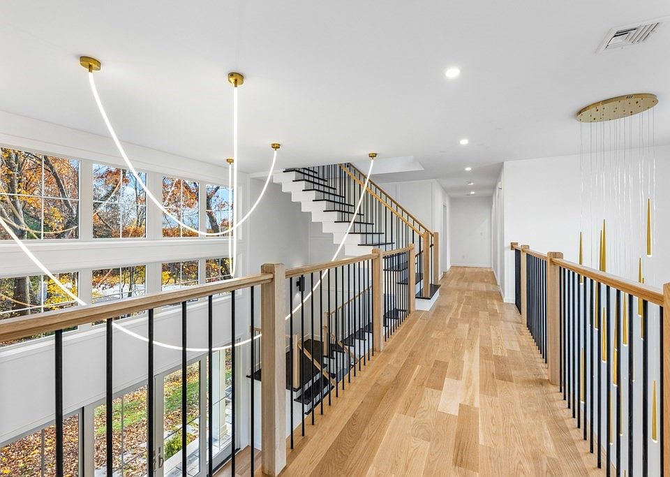 Explore this extraordinary 5/5/2 modern farmhouse crafted by a local designer/builder with 47 years of uncompromising standards. Thoughtful, functional design meets today’s lifestyle. The heart of the home is a chef’s kitchen with an entertainment-sized island, hidden pantry, 48" Thermador refrigerator, multi-function double oven, and induction cooktop, all framed by expansive windows with sun-drenched private views. The family room features a soaring fireplace with a marble wall and striking rope lighting. Flexible dining spaces add balance. The 1st-floor in-law suite offers sliding doors to the deck. Level 2 features sparkling raindrop lighting along the bridge hallway leading to two en-suite bedrooms & a luxurious primary suite with a spa bath, soaking tub, and walk-in shower. The 3rd-floor black-and-white au pair suite adds modern style. The pub-style basement with above-ground windows offers space for a golf simulator, a very cool home office, or a fun playroom! 26x4 covered porch