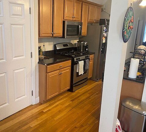 Great location, newly renovated apartment offers beautiful hardwood floors throughout the first floor, while the finished basement is carpeted and ideal for a family room, additional bedroom, or home office. The kitchen has been completely renovated with stainless steel appliances, granite countertops, and a convenient breakfast bar. The spacious open floor plan of the living and dining room is perfect for entertaining, enhanced by large bay windows that bring in natural light.