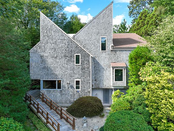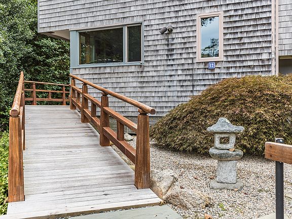 Woods Hole Village Contemporary!! New to market. Convenient to all Woods Hole has to offer. Delight your senses in this warm and inviting home. Featuring soaring cathedral ceilings detailed with wood accents create a harmonious and airy feeling throughout. Living room with gas fireplace and built in book shelves, open to the dining area and kitchen with under counter refrigerator and freezer. A chef's delight with a five burner gas range. Upstairs you will find a king sized primary suite separated into two rooms. Up another level the second bedroom awaits with built in dresser for ample storage. A small loft/office space is also on that level. Set back on a delightfully private lot this house features a Japanese themed garden in the back. Full basement and economical gas heating system and air conditioning.