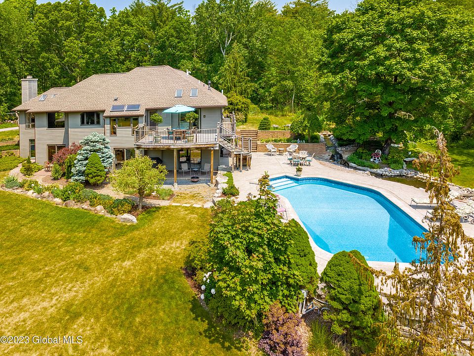 A private retreat in the heart of Ballston Lake. This stunning and spacious ( 3712 sf ) custom home sits on a private 10.24 acre lot, lushly landscaped with large pond. Chefs kitchen, featuring lrg island w/ Amazonian granite, 5 burner cooktop, under cabinet lighting, work station, Brazilian Teak flooring. Living room w/ FP ( Onyx and marble.) Views of pond from most rooms. Master BR suite w/ door to deck, walk in closet, red birch floors,view of pond/pool. Stunning master bath w/ walk in tiled digital shower w/ 6 jets, 2 sided FP, jetted soaking tub. All lower br's all walkout, all w/ view of pond. Amazing outdoor space with retaining walls, loads of perennials, fruit trees/bushes, waterfall/stream leading to the pond. In ground pool overlooking the pond, with plenty of entertaining space