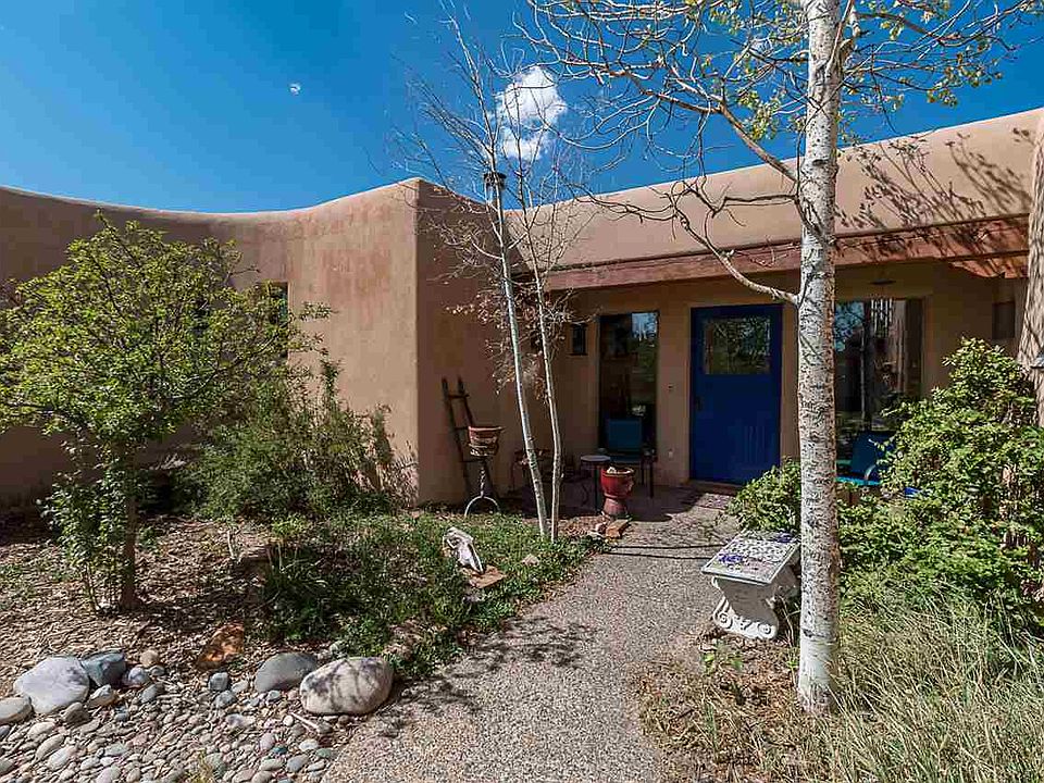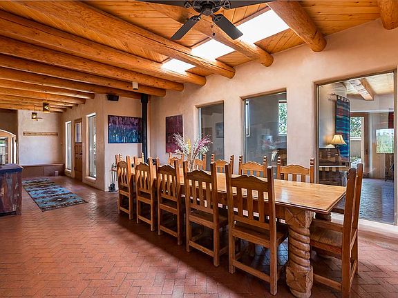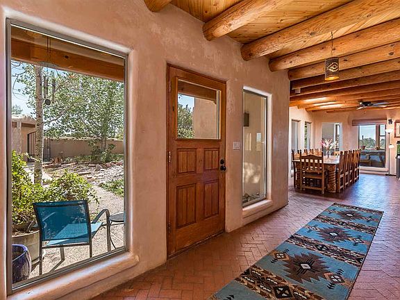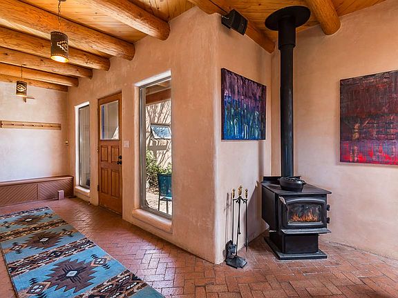 Spacious and inviting home with hard troweled plaster finish, brick floors, vigas, beam and t&g ceilings. Exterior walls are Rastra concrete forms. Complete new stucco of home and walls done in 2019 with warranty. Entire new roof installed in 2019, also with warranty. Interior of home is open floor plan, but nicely defined for living, dining, kitchen, and casual den spaces. All new Bosch appliances in kitchen and new washer and dryer in laundry room. The main living is on the ground level, and there are charming loft spaces over each of the bedrooms for additional living space or play areas for the kids or grandkids. All rooms have fresh paint and new carpeting in lofts. Bonus space with windows, skylights, and new flooring can be used as a home office, studio, or family room and also has entrance from the front courtyard. There is a functioning in-floor radiant heat system, and also a wood stove and two kiva fireplaces to add warmth and charm. There is an over-sized 3 car garage for cars and toys and extra storage. Lot is next to a green belt, and has good tree coverage. Walled entry leads to enclosed courtyard, and there is a good-sized portal off the den for comfortable outdoor living. House is set back from the street, providing good privacy, and there is plenty of extra parking for guests.