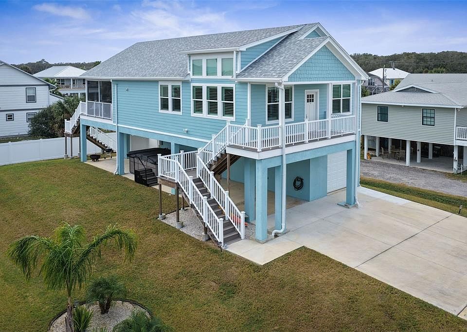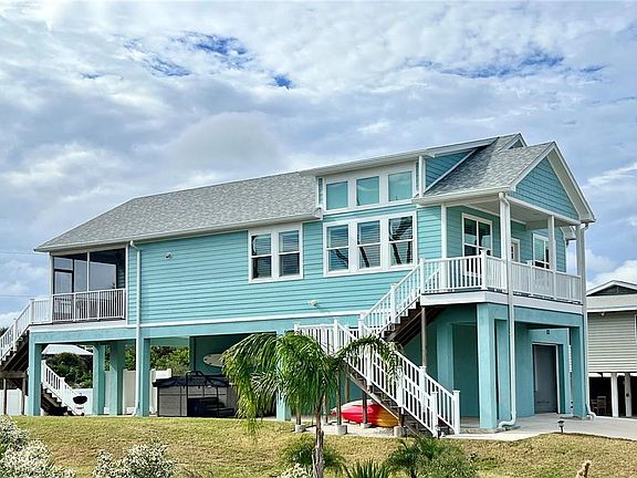 No work required! Practically new, completely furnished, turnkey beachside home. You are a suitcase away from relaxing on the beach, golfing, kayaking or fishing. Splash in the new swim spa. Swim, float or hang out in the hammock. Use the beach bikes, or paddle boards. Even the towels are included. This 3/2 bath home is located in a safe residential beach community. Walk or bike to the beach on a quiet residential street with dedicated access at end of street. The uncrowded beach has miles of soft sand to explore, with no cars, crowds, or traffic. Good surfing, swimming and fishing. No HOA. Short term vacation rentals allowed. This 2 story stilt home features soaring vaulted ceilings and a great room design. 3 bedrooms on the main level with luxury vinyl flooring throughout, light bright colors, impact rated doors and windows. Low maintenance hardi siding, trex decking and tons of parking. The kitchen features porcelain countertops, soft close cabinets with pullout shelves, a 5 burner cooktop with double oven, and stainless appliances. Primary suite has 8x10 walk in closet, private bath with tile floors and large shower. Dual vanity with quartzite tops and stainless fixtures. 2 guest bedroom and 2nd bath on this level. Ground level has 18x24 heated and ac "man cave" game room. Built in 2023 home features include: Hurricane rated impact windows and doors, luxury vinyl flooring, plantation shutters, remote controlled blinds, porcelain and quartzite countertops, designer level appliances, trex decks, swim spa, fully furnished, multiple parking spots, vinyl fencing, and "stubbed" in for an added bath on first level. Oversized one car garage and extra parking with large carport and concrete driveway parking. Sunny back deck with outdoor shower and screened covered deck off kitchen and bedroom. There is also a pre-wired location for elevator lift off rear deck. Beach allows dogs. Great home for full time living, vacation home, or short term rental income.