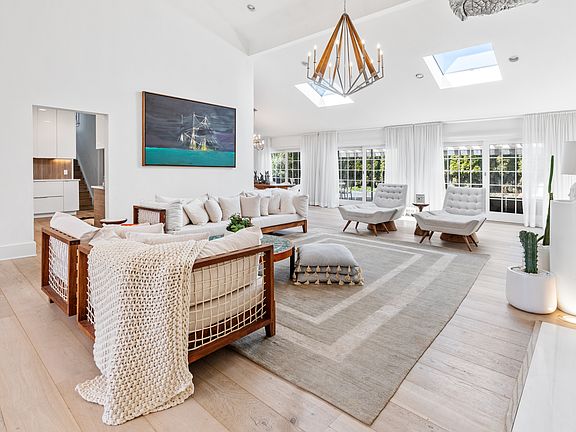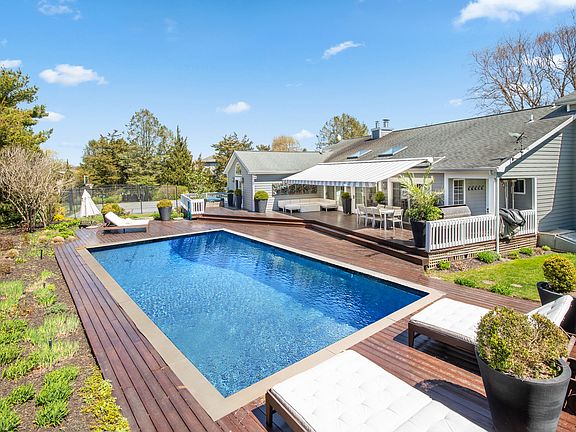Rental Registration #: 24-3600 Set on nearly an acre of prime south-of-the-highway Water Mill land, this recently renovated Hamptons haven boasts privacy, loft-like flexibility, and effortless flow for seamless indoor / outdoor living and entertaining. Encompassing 3,850 sf of living space with 4/5 bedrooms, 3 full and 1 half bathrooms, this contemporary two-story residence features a gracious approach, discreetly situated tennis court with basketball hoop, expansive mahogany deck, heated vinyl pool, swing set, play area, and in-ground trampoline. Heritage trees, lush cutting gardens and mature plantings create multiple settings, including a barbecue and dining area, to enjoy for private gatherings or relaxing summer afternoons. Situated on a quiet residential cul-de-sac, this centrally located sanctuary sits among some of Water Mill's most desirable swaths of legacy farmland and waterfront property. Skip the traffic on Montauk Highway and travel exclusive back country roads to The Cut, or Flying Point Beach, Mecox Bay and the finest shopping and dining that Southampton Village has to offer. Enter the well-appointed property from the foyer into dramatic, sun-drenched, double height open plan living and dining areas that open to the garden and pool beyond. Casual living room seating areas with views of the garden and pool are complemented by the elegant, modern profile of a feature stone clad fireplace. The home's wide plank oak finish floors are further accented by the kitchen's clean, modern wood finish and white lacquer kitchen cabinetry, sleek white countertops, white ceramic cooktop and a subzero refrigerator. Designed for ease, the kitchen's open serving peninsula is the heart of the kitchen equally convenient for morning coffee with your family or an impromptu cocktail gathering with friends. The beauty of the home's open plan layout on the ground floor is further accentuated by a prized, second story retreat featuring garden views, a balcony overlooking the pool and wall-to-wall built-ins that are move-in ready as a private office, library, or recreation room. A sprawling, double-height first floor master suite, adjacent to the living room, adds drama with a Palladian window and sliding glass doors that open to the deck and cutting garden. The inviting master suite bathroom showcases a dramatic ceiling height, soaking tub, steam shower and double vanity. A spacious bedroom with 3 cabin beds and an en suite bathroom, ideal for a family with 3 children, boasts generous windows and daylight. Two distinctive ground floor guest bedrooms with garden views share a pristine bathroom. The finished lower level is home to generous storage space, cedar closets, laundry and ample, carpeted space for additional fitness with a treadmill and weights, a playroom with ping pong table, hockey table, basketball hoops, or service use. The attached 2-car garage is the finishing touch on this uniquely accommodating and private Water Mill estate.