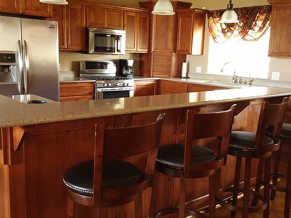 This Custom Built Home: Has Quartz counter tops through out, Hardwood Floors, Tiled floors, Jetted Tub, Gas tank less hot water system, Central Vacuum, Kinetic Water softener, Beautiful wood Cabinets, 2 fireplaces, ceiling fan, covered deck, covered patio, garden area, & quality appliances. Make an appointment today to view. It Has a Mother In Law apartment or small apartment to be rented. It is out of town but within walking distance. All this sits on 2.07 Acres. Built in 2010.