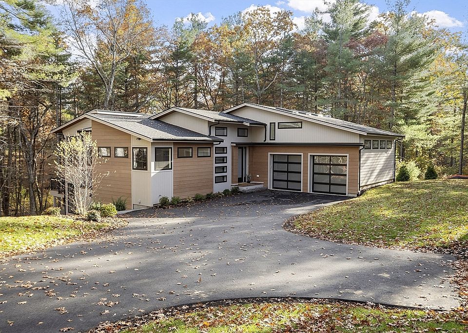 Brand new custom contemporary five-bedroom home on 2.5 acres in a quiet Lincoln cul-de-sac! Enjoy bucolic views of mature trees and a tranquil pond from the open-concept main living area featuring walls of windows, cathedral ceilings, a striking stone fireplace, wet bar, and direct access to a massive back deck. The stunning modern kitchen offers oak upper and white base cabinets, professional-grade Miele appliances, and an oversized island perfect for cooking and entertaining. The main level includes two bedrooms: a luxurious primary suite with balcony, spa bath with soaking tub, separate shower, double vanity, and heated floors, plus a second bedroom and sleek full bath. The lower level features a spacious family room with fireplace, bar, porch access, and three additional bedrooms including a secondary suite with ensuite and walk-in closet. A upper floor home office completes the home. A true modern masterpiece near conservation trails and the Lincoln train to Cambridge and Boston!