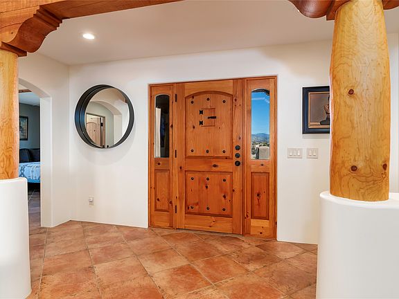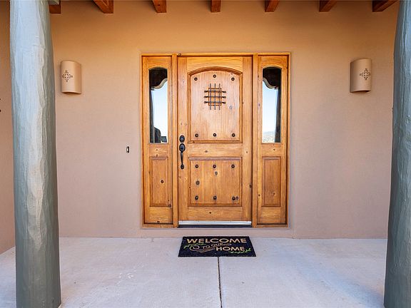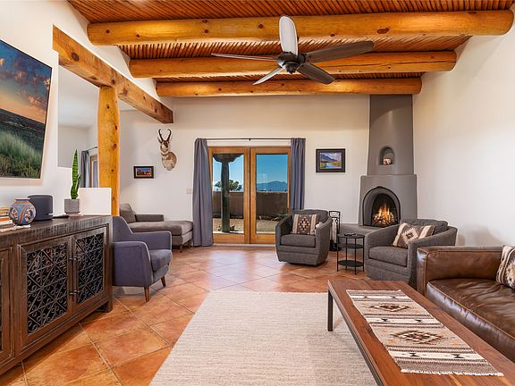 12 Quedo Road has been meticulously updated throughout with modern touches that showcase the southwestern elements of the home. The main living areas separate the primary bedroom and ensuite bathroom from the remaining two bedrooms for maximum privacy. The south side of the house features a large enclosed courtyard with two spacious portals and a hot tub, all surrounded by a privacy wall. Sunrises and sunsets are both viewable from the south courtyard, as are the open landscape and mountain views. A smaller courtyard (also with gate entrance and privacy wall) is located at the north of the house by the main entrance, and from here views of the Sangre de Cristo mountains can be enjoyed. Exterior improvements include new stucco and new paint (both completed in October, 2023). Interior improvements include new boiler and new water softener with whole-house filter and reverse osmosis filter (completed in September 2023); updated electrical features, including ceiling fans, light fixtures, and electrical outlets; new paint throughout the home; new kitchen sink; new bathroom faucets; new glass shower door; and a new Pella door with in-glass blinds in one of the secondary bedrooms. There are two wood-burning kiva fireplaces in the home, one located in the living area and a second in the primary bedroom. The house is offered fully furnished, at no additional cost to the buyer. This beautiful home is located in the quiet, dark-sky community of Eldorado. Schedule your showing today!
