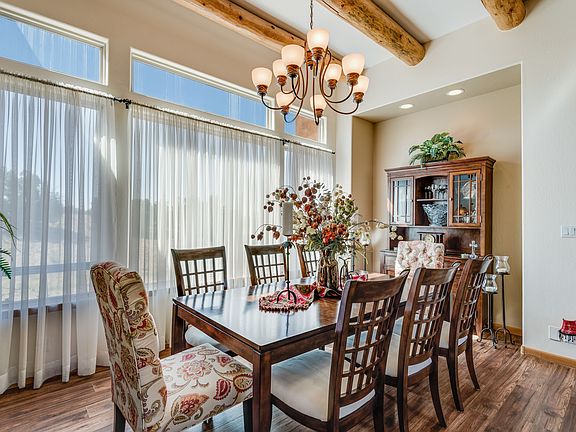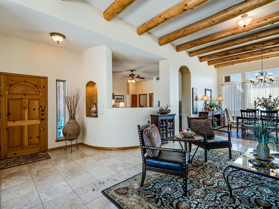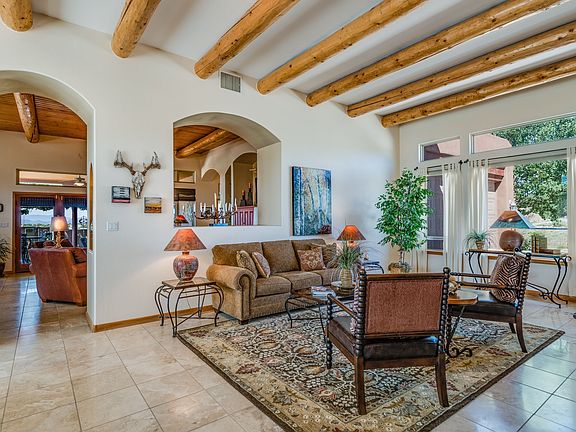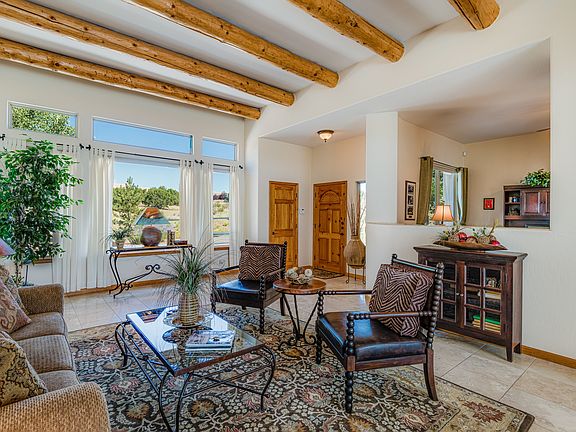 Outstanding home with studio on a view filled 1.09 acre estate lot. This single level, south facing home brings in warming light and showcases beautiful mountain views. The open floor plan flows beautifully from room to room and offers great separation of space. Enter a generously sized living room and formal dining room with soaring ceilings, tiled floors, and vigas. There is a library or office to one side and three guest bedrooms, one with exterior entry, and full bath. On the opposite end there is a gorgeous kitchen with granite counter tops, ample upgraded cabinets, and built-in desk near the breakfast nook. The kitchen overlooks the family room with kiva fireplace, vigas with wood ceilings, and access to the huge covered portal. The master bedroom is spacious with luxurious master bath and large walk-in closet. The exterior courtyard has an abundance of landscaping, rock fountain, and southern views for watching the stunning Santa Fe sunsets with three distinct areas to enjoy the gorgeous outdoors. Attached 539 square foot heated space has a separate entrance and makes an ideal studio or man cave plus two car garage. This home is meticulous and beautifully kept. Rancho Viejo is conveniently located approximately 12 miles form the Plaza and offers easy access to 599 and I25 for commuters. This great neighborhood has large parks and open space plus over 10 miles of paved walking trails.