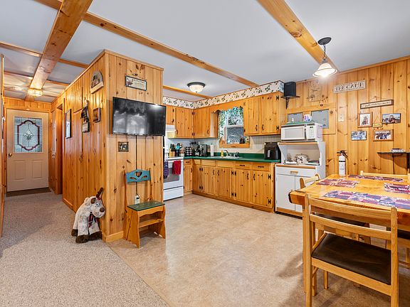 Upstairs, you'll find an open loft that currently sleeps six, along with a den area and a half bath, ideal for hosting family and friends. Knotty pine walls and cabinetry throughout the home add warmth and classic camp charm.