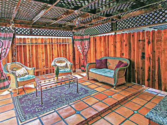 Private, Gated, and Secure with Coded Entry and Off-Street Parking. Relaxing Outdoor Cabana Room, Sofa and Chairs.