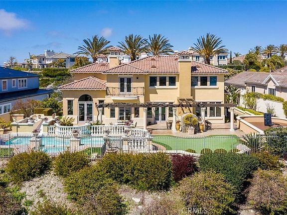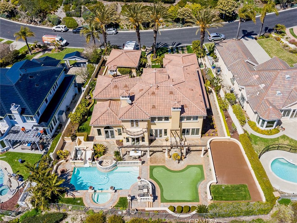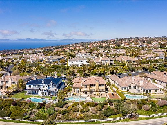 This impeccably maintained 4,678 sq.ft. Catalina view luxury estate is situated on a 1/2 acre flat lot behind the gates at the exclusive Vantage Pointe community in Rolling Hills Estates. The home is welcoming and grand as you enter through the double doors to the two-story foyer. The large living room to the right features cathedral ceilings and a magnificent fireplace adjacent to the formal dining room. The spacious kitchen is appointed with high end appliances and an oversized island open to the breakfast table and living room complete with another cozy fireplace. The main level is designed for family living and entertaining with its connection to the backyard and game room off the living room. The back yard has been transformed into a resort like oasis including a pool with a slide, separate hot tub, sport court, putting green, Argentinian style BBQ and lush landscaping with views of the Pacific Ocean. Walk around the corner to access a second, freestanding garage which can double as a guest house, artist's studio or gym. Back inside, two large bedrooms with connected baths, a large laundry room and powder bath complete the downstairs. The primary suite on the second floor is the perfect place to escape to after a long day with a spa like bathroom, separate sitting area with a fireplace and a private balcony with spectacular ocean views. Two other bedrooms on this level are perfect for kid’s rooms, guest rooms or at home offices. This opulent estate is ready for you to call home.