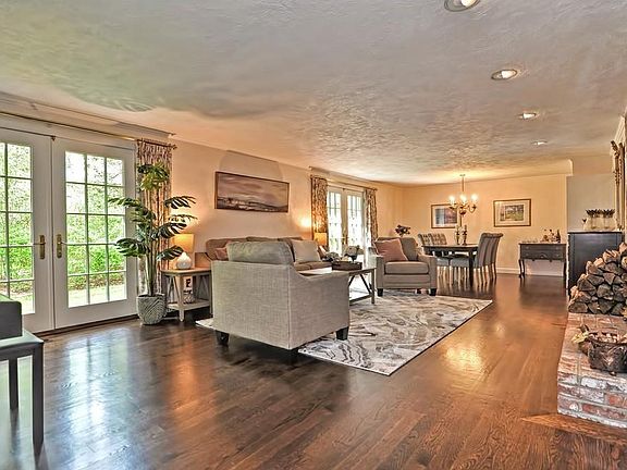 Now is the time to seize the opportunity to make this enchanting residence your home! This custom-designed house is situated in a picturesque setting not far from North Street. The flexible floor plan allows for choice of master bedroom on either 1st or 2nd floor. The first floor features stunning hardwood floors and an expansive living/dining area with a double-sided fireplace, also enjoyed from the customized eat-in kitchen. The first floor includes a generous bedroom, den or additional bedroom, 1 & 1/2 enhanced baths, and laundry/pantry. Three sets of French doors lead out to almost an acre of well-maintained grounds. The upper floor has an ample landing (suitable for work desk area), two substantial bedrooms, and an attractive tiled bath with whirlpool tub/shower. Multiple eave closets allow for considerable storage. Lower level has a large well-appointed family/media room. Rarely will you find such an immaculate property, as both original and present owners were engineers