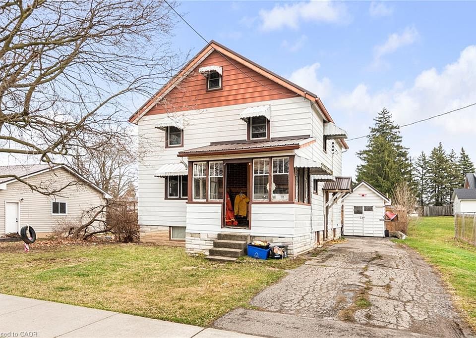 2-1/2 storey home with lots of potential in Cayuga. Spacious rooms throughout. Features large eat-in kitchen, separate dining room, 3 bedrooms, walk-up attic, and a full basement. Next to an elementary school and walking distance to town amenities. Sunroom on the main floor at the front of the house. Paved driveway and a large shed. Steel roof, vinyl windows. All sizes approximate. Being sold "as is".