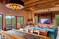 Kiva fireplaceSunset mountain viewsDedicated exercise roomCarved woodworkElegant in-ground cocktail poolGated courtyardFull kitchen