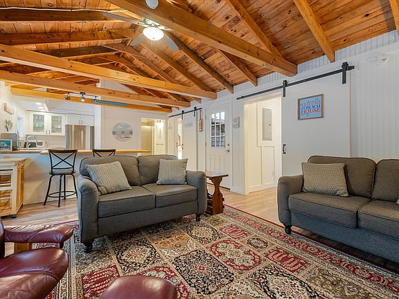 The floor plan spans 806 sq. ft. and comprises 2 bedrooms, 2 baths, along with an open concept kitchen and living area. This inviting space showcases vaulted wood ceilings embellished with exposed beams, adding to the overall sense of openness and warmth. The interior exudes a coastal feel, enhanced by beadboard walls, barn doors, and a thoughtful color palette that perfectly complements the nearby seaside surroundings.