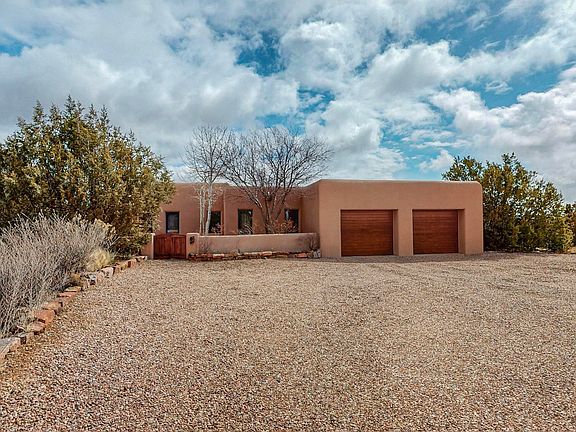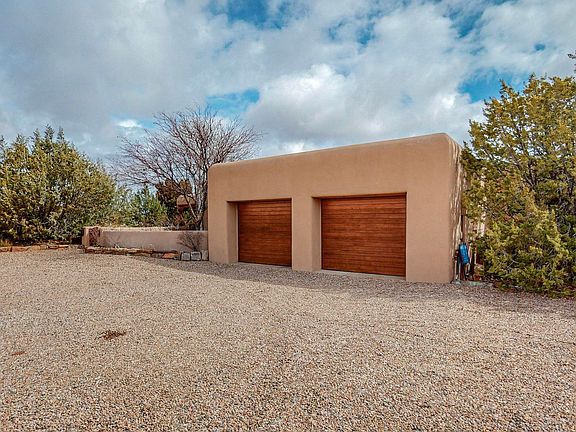 Enter this classic Pueblo Revival- style home through a landscaped courtyard. Brick floors, high ceilings with vigas and beams, knotty alder wood doors and cabinets, diamond plaster walls, and lovely distance views of the Sangre de Cristo mountains complement the residence. The chef’s kitchen includes a center island, gas cooktop, granite countertops, tile backsplash, and a large pantry. The spacious owner’s suite, with a private patio, features a kiva fireplace and a generous walk-in closet. The guest bedrooms are well-separated from the owner’s suite, with a shared full bath and a powder room. Stunning views of the Sangre de Cristo Mountains. Ductless air conditioning.
