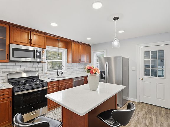 Welcome home to this beautifully updated 3-bedroom, 1.5-bath ranch blending timeless charm with modern convenience. Step inside to discover newly refinished and stained hardwood floors on the main level. All new electrical done throughout the home and recessed lighting throughout the living room and kitchen. The open-concept kitchen and living space is perfect for entertaining, featuring solid quartz countertops, stainless steel appliances, a large center island, and seamless flow into the living area. Enjoy year-round comfort with a brand-new furnace, and take advantage of the spacious unfinished basement offering ample storage and a dedicated laundry area. Outside, relax or entertain on freshly painted wood decks in both the front and back, while new siding adds sleek curb appeal. Other improvements include new carpet and flooring, full interior repaint, new kitchen appliances.