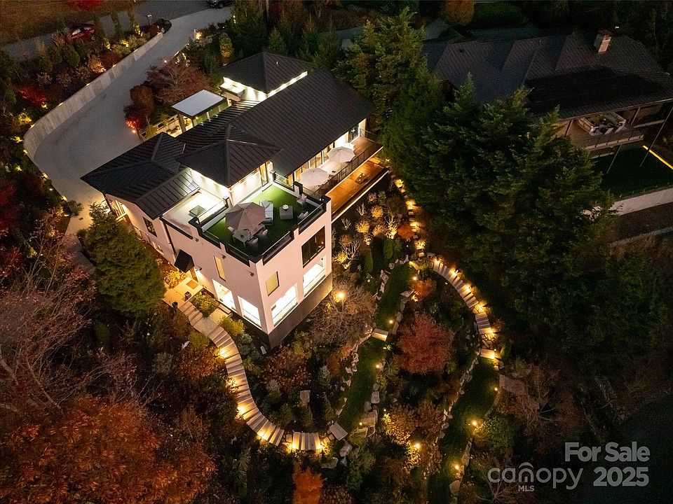 Beyond the walls, the grounds are a curated masterpiece: rare specimen plantings, terraced beds, artful hardscaping, and dramatic lighting that transforms the gardens after dusk.