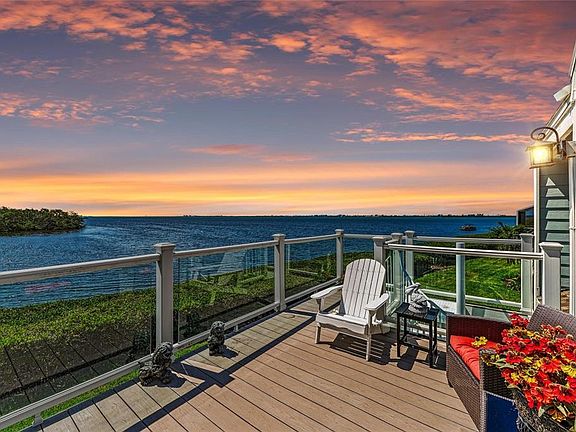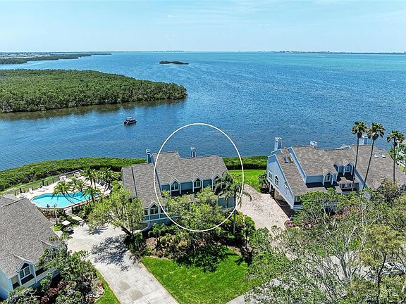 Tidy Island classic waterfront home with magnificent panoramic water views of Sarasota Bay. Even the stargazing is magnificent! Discover the epitome of waterfront living with three bedrooms and two-and-a-half baths in this 3,277-square-foot home. This beautiful home invites you to experience the joy of sun-soaked days and tranquil nights by the Bay, with timeless architecture, spacious interiors, high ceilings, an abundance of natural light, plus a wood-burning fireplace and private elevator. This is your opportunity to call Tidy Island home, where every day feels like a vacation. This classic floor plan is designed for easy living with wood flooring in the kitchen, dining and living room all flowing together and wonderful for entertaining and family gatherings. Enjoy the custom-built kitchen with two ovens, two dishwashers, granite counters, island with sink and breakfast bar, wine refrigerator, tile backsplash, built-in desk and pantry. The large primary bedroom offers a walk-in closet, en-suite bath with a classic claw foot bathtub, quartz counters, dual sinks and plenty of cabinet and shelving space. On the top floor, enjoy a big office/loft with built-in bookcases plus two bedrooms and shared bath. Go out onto the balcony just off the sun/Florida room to relax and experience breathtaking water views of Sarasota Bay to downtown Sarasota. Take the spiral staircase to the ground floor lanai area to enjoy grilling, picnics and family gatherings. Additional great features include large storage room with epoxy flooring, interior atrium, Hunter Douglas remote control blinds, vaulted ceilings, two new air-conditioning units, two-car garage with epoxy floors, crown molding and ceiling fans throughout. The association fee includes cable, internet, water, sewer, garbage, lawn maintenance, pest control, exterior painting and roof (replaced in 2021). Tidy Island residents enjoy access to two pools and spa, fitness center, Har-Tru tennis courts, walking trails, scenic boardwalks, 24-hour security guard gate, social gatherings in the clubhouse with catering kitchen, outdoor deck with bar and gazebo. Enjoy the lush nature trails that invite you to immerse yourself in the beauty of the surrounding preserve. A kayak launch provides easy access to the Sarasota Bay plus a historical museum. Conveniently only minutes from the sugary sands of Anna Maria Island, grocery stores, shopping, restaurants and golf course. Watch the video and click on the tour to virtually walk through the house.