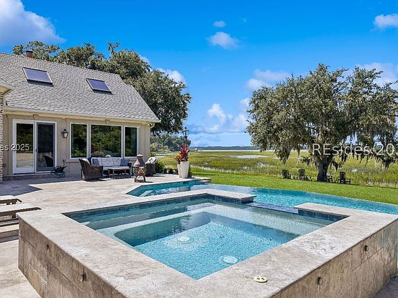 (A Buying Opportunity!) Experience the pinnacle of Lowcountry luxury in this meticulously updated custom home, where breathtaking marsh-to-river views unfold beyond a canopy of grand live oaks. Thoughtfully designed for both refined living and seamless entertaining, the home welcomes you through a private gated garden into a sun-filled interior with soaring 12-foot ceilings and elegant architectural details. At its center is a chef's kitchen featuring a Wolf range, four ovens, Sub-Zero refrigerator, dual dishwashers, wine fridge, and a striking 10-foot island perfect for hosting. The first-floor primary suite is a private retreat with dual walk-in closets, a dedicated laundry room, and tranquil views. Additional features include a spacious bonus room, custom closets and built-ins, two laundry areas, new carpet (2023), updated HVAC (2020), resurfaced and retiled pool (2025) with a premium heat/cool pump (2024), epoxy-coated garage floor, and a brand-new roof (September 2025). Outdoor living is enhanced with UV-protected windows, professional landscaping, and a custom fire pit for evening gatherings. Blending timeless elegance with modern functionality, this exceptional home offers a truly elevated coastal lifestyle.