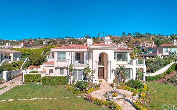 It's a pleasant surprise when you enter a home that appears so grand and stately on the outside, only to find it's positively warm and hospitable on the inside. This magnificent estate stands proud on Via Del Cielo in the prestigious and secure community of Oceanfront Estates. A wide front lawn and splashing fountain welcome you, and when you step inside you'll find yourself in a cinematic entryway. If you like, stop off at the casual bar and family room to pour your beverage of choice before you ascend the dramatic wrought iron staircase to the lofty main living areas above. Sunlight floods this cheerful area with comfortable seating around a cozy fireplace, and an elegant dining area. Make your way back to the kitchen where wondrous meals are sure to be created. The back yard invites play and relaxation with a shimmering swimming pool, putting green and outdoor kitchen. At the end of the day, it's all about the heavenly master bedroom with fireplace and a private balcony overlooking the ocean and sky. This grand yet gracious home is the embodiment of the coveted California lifestyle.