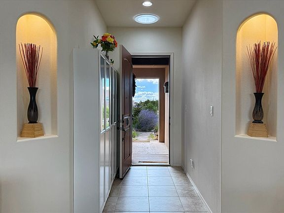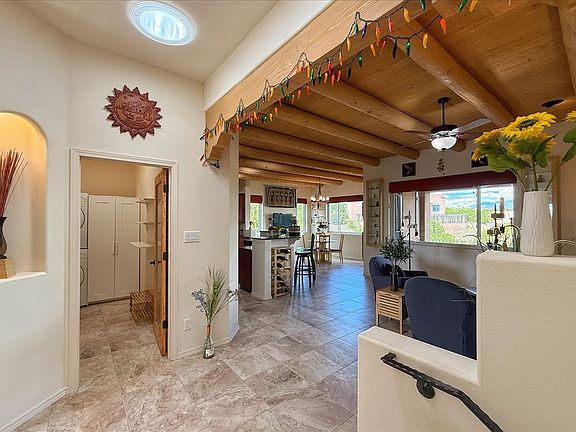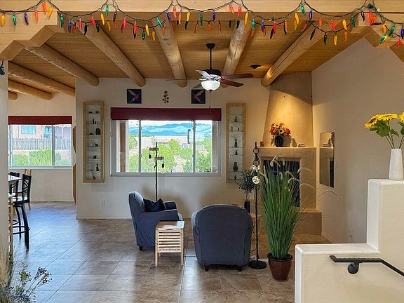Beautiful 3-bedroom, 2.5-bath home built in 2015, perfectly situated on a 0.34-acre lot surrounded by natural pinon and juniper open space, just 8 minutes from downtown Santa Fe. Offering 1,850 sq ft of thoughtfully designed living space and a finished 3-car EV-ready garage with workbench area, shelves, and overhead storage, this single-owner home blends Santa Fe charm with modern efficiency. Tall ceilings and large-format tile floors enhance the open feel, while wood ceilings with vigas and latillas add warmth. The kitchen features granite countertops, under-cabinet lighting, gas range, ENERGY STAR® appliances, and hood-mounted microwave. Expansive picture windows frame Sangre de Cristo views, filling the home with natural light. Step from the dining area to a covered patio and a private screened spa retreat with multi-person 220V hot tub off the primary suite. The spacious primary suite offers room for a home office or yoga area, plus a walk-in closet with custom Modular Closets® and built-in staircase to high-bay storage. The primary bath boasts an oversized walk-in shower with no glass door and a private toilet area. Energy efficiency abounds with 31 owned solar panels to power spa, home and 300 miles daily for up to 3 EVs, foam-core insulation, radiant floor heat, solar tubes, recirculating hot water, whole-house fan, and motorized exterior sunshades. Additional features include a water softening and revese osmosis systems, radon mitigation, low-VOC finishes, and a partially concrete driveway for easy snow removal. The driveway can accommodate 5 cars in addition to garage. Outdoors, enjoy professional landscaping, drip irrigation, a secluded flagstone patio for dining or stargazing, a fully fenced garden area with shed, and rainwater barrels. Scenic walking trails with mountain views. Convenient access to Hwy 599 makes commuting to Los Alamos or the Santa Fe Airport a breeze—this home delivers mountain views, sustainability, and comfort in one perfect package.