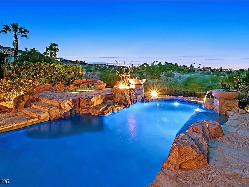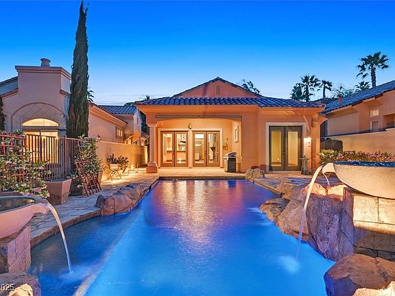 RARE OPPORTUNITY: Lowest-Priced Golf Course Home in Lake Las Vegas! Experience resort-style luxury in this stunning single-story estate, featuring prime Reflection Bay Golf Course frontage and spectacular mountain views. This home is an incredible value, priced to be the lowest on the golf course in all of Lake Las Vegas. Enjoy exceptional outdoor living with a custom PebbleTec pool & spa, built-in firepit, and a spacious covered patio overlooking the course. The elegant interior showcases all-slate flooring, custom baseboards, crown molding, and high-end granite counters throughout. Every one of the bedrooms is a private en suite. The gourmet kitchen boasts professional GE Monogram appliances and is perfect for entertaining. Located within a private, gated community in desirable Henderson, this property offers an unmatched blend of elegance, privacy, and true resort living. Don't miss this opportunity for exclusive golf course living at an unbeatable price!