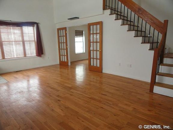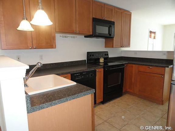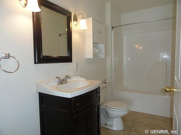2006 built contemporary home with over 1845 sq. ft. of living space. 3 BR, 2 full baths, bathed in soft sunlight from custom windows and doors throughout. Glistening hardwood flooring & a soaring cathedral ceiling accents the living room with an open stairway that leads to a balcony loft above - & a master suite, complete with master bath w/Jet tub, separate shower & dual sinks. Upstairs laundry. Lower level features a modern U shaped kitchen, full bath, 2 more BR's & a dining area overlooking a deck & shaded back yard, sprinkled with evergreens. Garage. Village lot close to NYS Thruway. Midlakes Schools! 600+ credit score, strong income and references are a must! Security Deposit = 1 month rent. Available 2/1/26